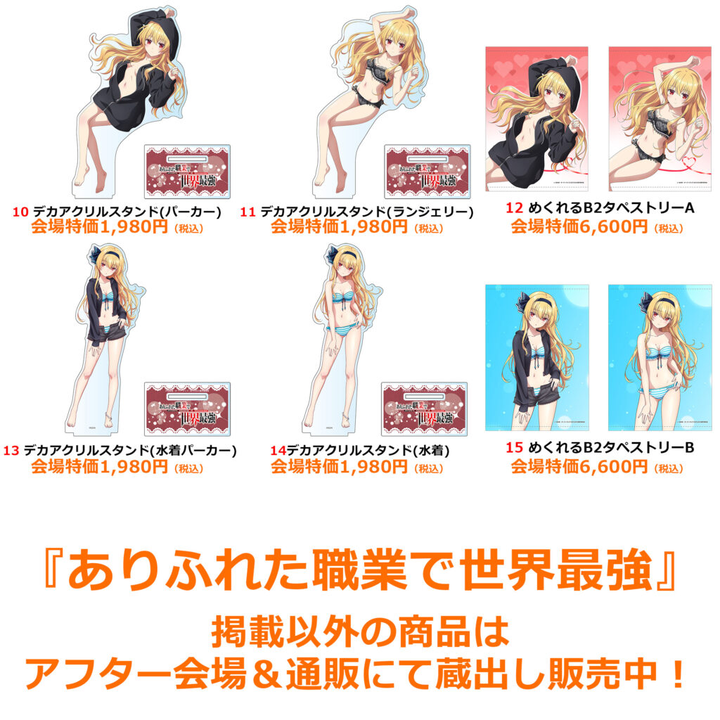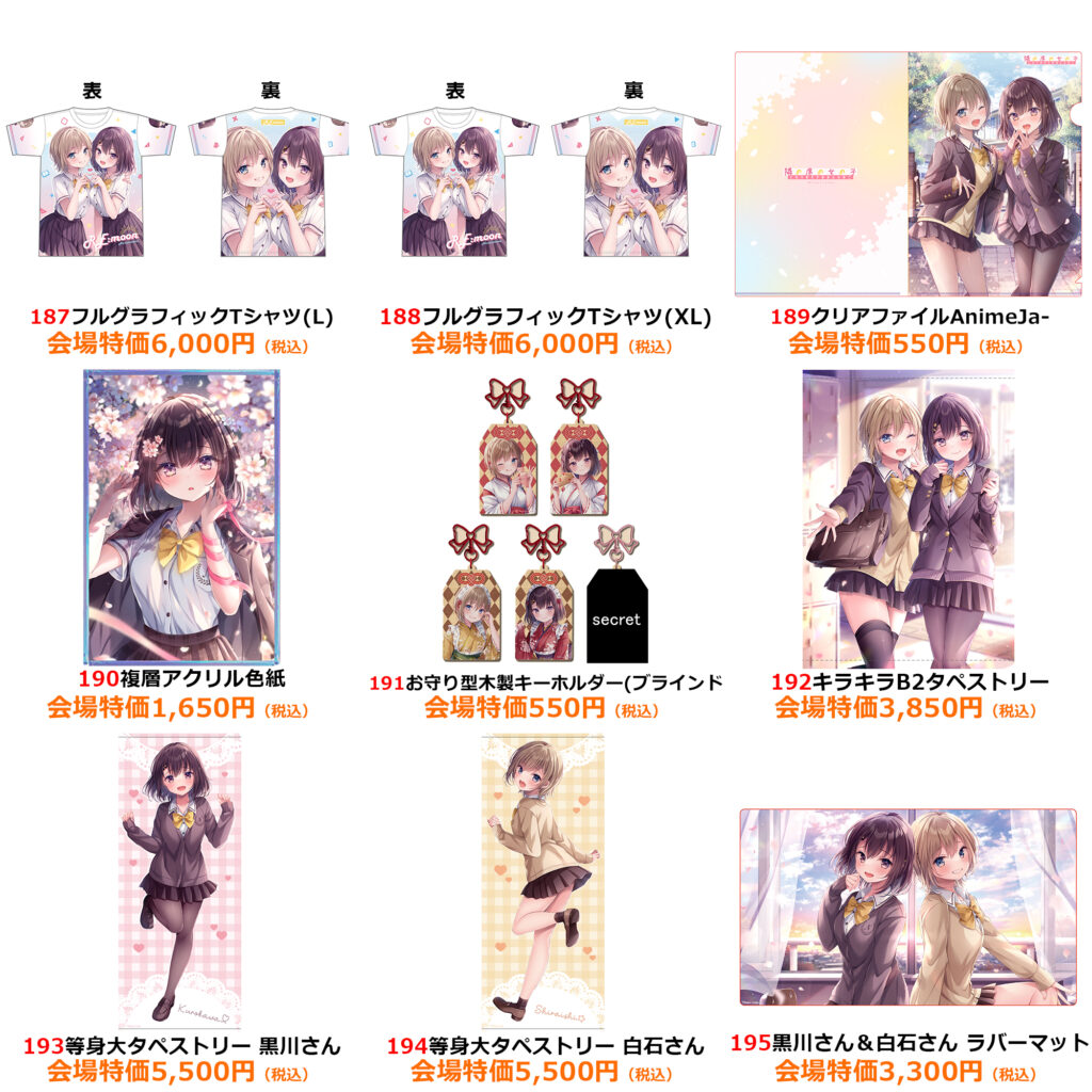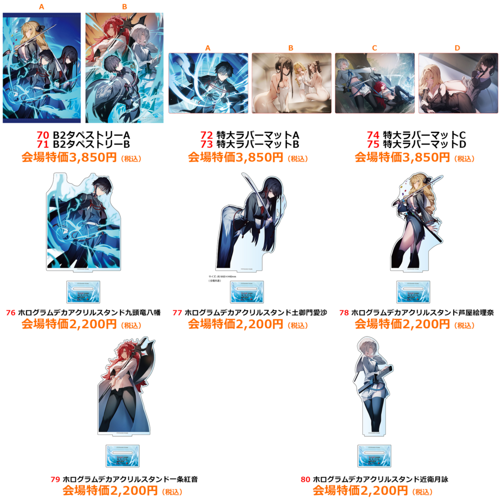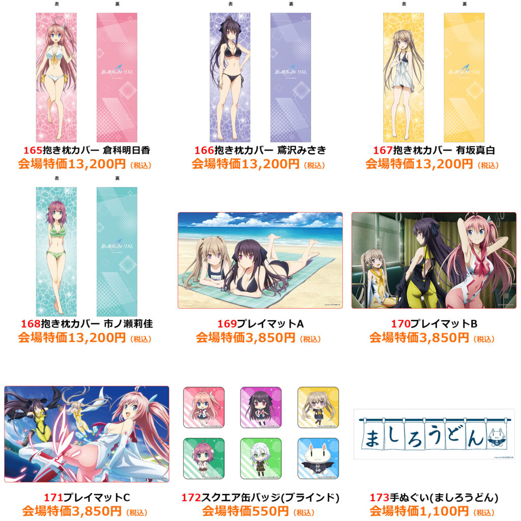 | 注意事項 | ●商品画像はイメージです。実際の商品とは異なる場合がございます。 ●商品・配布物につきましては、数量に限りがございます。予めご了承ください。 ●内容に関しまして、予告なく変更や中止となる場合がございます。 ●混雑時や荒天時など、安全が確保できないと判断した場合、列の作成を一時停止したり列を解消することがあります。 ●徹夜など、前日からの会場付近への来場は禁止されております。 ●会場係員の誘導、指示に従ってください。ご協力をお願いいたします。 |
